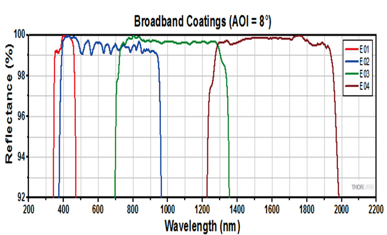 宽带电介质膜反射镜均采用了多层膜,它由不同折射率的膜层叠加而成。设计时,其入射角被设定为45°。此类反射镜实现了前所未有的宽反射带。