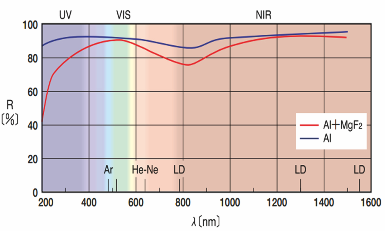 可以提供纯铝膜反射镜和覆盖了氟化镁(MgF2)或二氧化硅(SiO2)保护膜的铝膜反射镜。